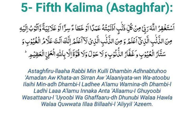 The 5th Kalma, known as Kalma Istighfar, is the declaration of seeking forgiveness. In English, it is translated as: