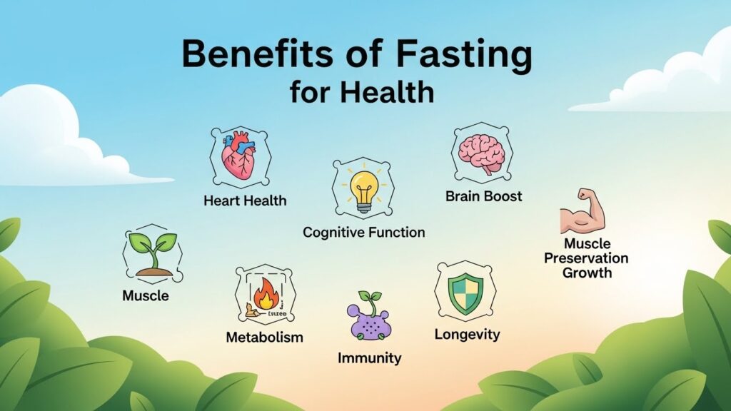 Benefits of fasting for health: boost metabolism, lose weight, improve brain function, and increase longevity.