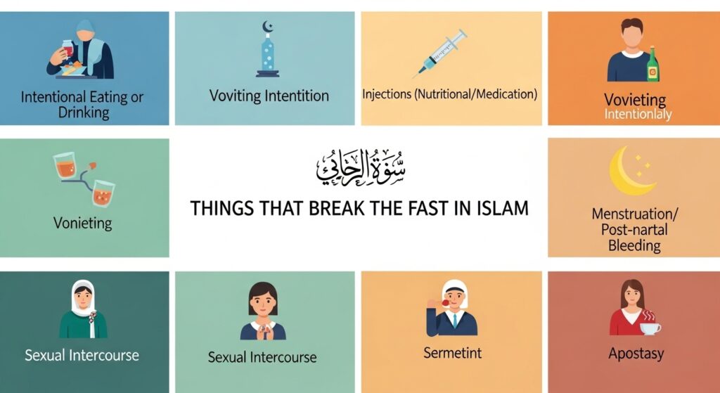 Learn about things that break the fast in Islam with clear Quran and Hadith references. Understand what invalidates fasting and what does not.